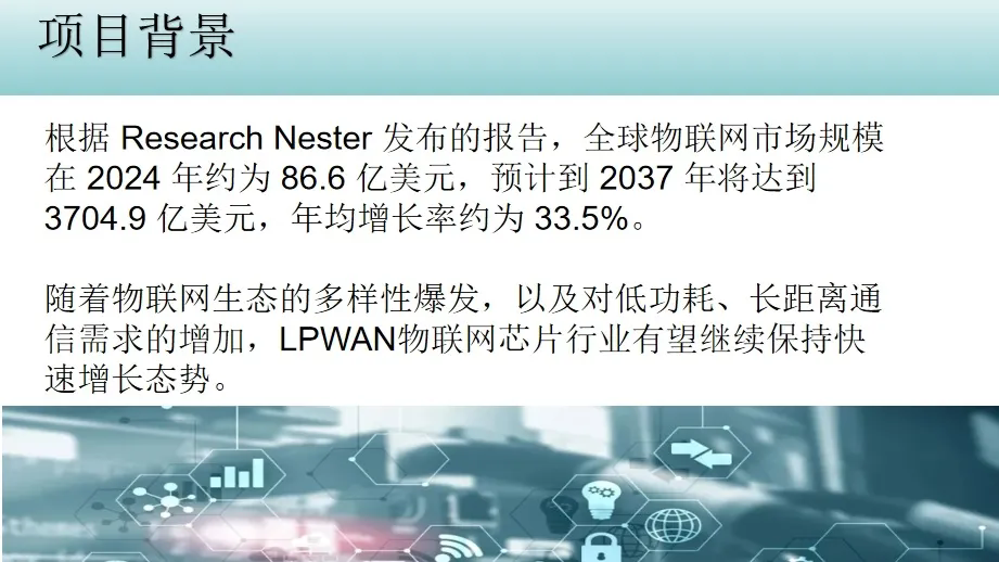 项目深耕物联网Sub-G与毫米波雷达领域,专注于半导体分立器件制造及物联网射频芯片研发。项目面向工业物联网、智慧城市、智慧农业、无人机图传等多种应用场景,聚焦射频收发机、数字射频SoC及软件无线电技术,开发了低功耗广域物联网SoC芯片、毫米波收发机芯片及卫星地面收发机芯片等多种核心产品,打造的柔性芯片满足物联网碎片化需求,累计量产芯片达数十亿颗。项目核心团队由锐迪科、华为等企业精英组成,毕业于清华、北大等顶尖院校,拥有近20年射频芯片设计经验。