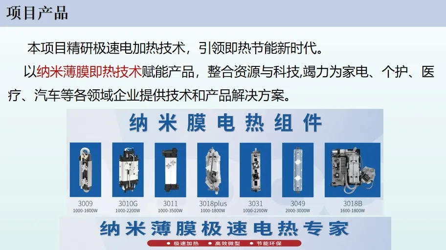 团队致力于纳米膜极速节能电热元件、电热模组及电器产品的研发、设计、制造、销售和服务。项目以纳米薄膜极热技术赋能产品,整合资源与科技,竭力为家电、个护、医疗、汽车等各领域企业提供技术和产品解决方案,目前已与九阳、飞利浦、苏泊尔、美的、海尔、苏宁等知名品牌合作。未来,项目将持续开发并应用领先的膜电热技术,引领国内绿色电器产业,为行业发展、环保“双碳”目标提供技术和配件支持。