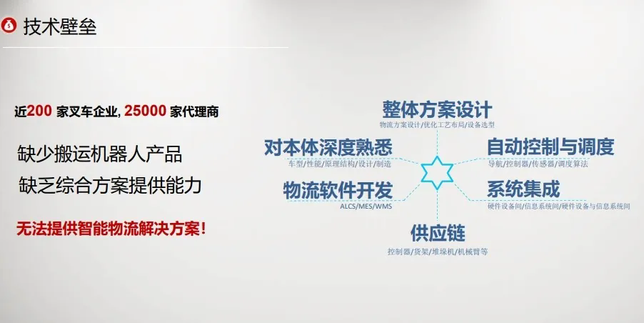 项目核心团队成员拥有叉车行业15年、软件行业10年以上从业经验,具有合力/杭叉/诺力等多家叉车企业的系统设计开发经验。项目专注于“物流+AI”构建工业企业超脑系统,推出以搬运机器人为核心设备的智能物流系统,满足自动化物流互联互通、统一调度、跨厂家作业等现实需求,目前已有成熟的智能配送整体解决方案、智能仓储整体解决方案以及垂直领域的行业解决方案,已完成在农业、固废、化工、轮胎橡胶等行业的项目布局。